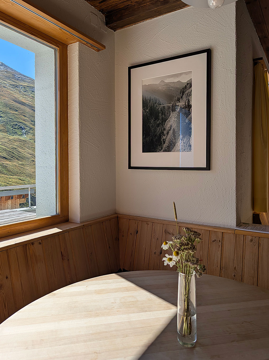 Die Genossenschaft Bergalga zeigt im Hotel eine kuratierte Sammlung von Kunstfotografien. Gemeinsam mit dem Fotografen Marc Deragisch aus Chur wählt der Vorstand prägnante Standorte im Tal, deren Aufnahmen jeweils in ihrer Blickrichtung präsentiert werden.